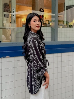 Tampil stylish dan elegan dengan blouse etnik hitam putih yang memadukan motif tradisional dan potongan modern. Blouse ini cocok untuk berbagai kesempatan, mulai dari acara formal, kerja, hingga hangout santai.